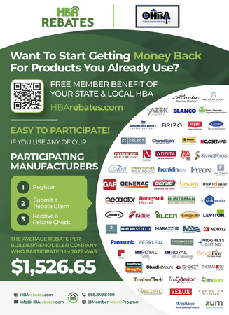 Additionally, builder and remodeler members have access to a FREE Member Benefit of OHBA via Member Rebate Programs where the average rebate for companies who participated in 2019 was $1,366.10.